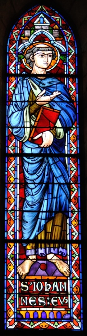 Saint Jean, Apôtre et Évangéliste. Fils de Zébédée, un des premiers appelés par le Seigneur, il fut, avec son frère Jacques et avec Pierre, témoin de sa transfiguration et de sa passion, et il reçut de lui, au pied de la croix, Marie pour mère. Dans l’Évangile et les lettres qui portent son nom, il se présente comme le théologien qui a pu contempler la gloire du Verbe incarné et qui annonce ce qu’il a vu.