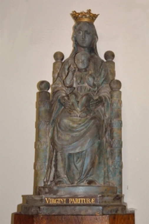 L’Enfant Jésus est représenté sous les traits d’un enfant de quatre ou cinq ans, assis dans le giron de sa mère, regardant droit devant lui, tenant la main droite levée en signe de bénédiction et portant dans sa main gauche, un globe terrestre autrefois surmonté d’une petite croix dorée. L’ensemble de la statue est de couleur sombre, parsemée de reflets bleus et violets et sur le piédestal, en lettres dorées, est écrite la fameuse inscription : VIRGINI PARITURAE. Cette statue, de belle facture, semble dégager calme et sérénité.
