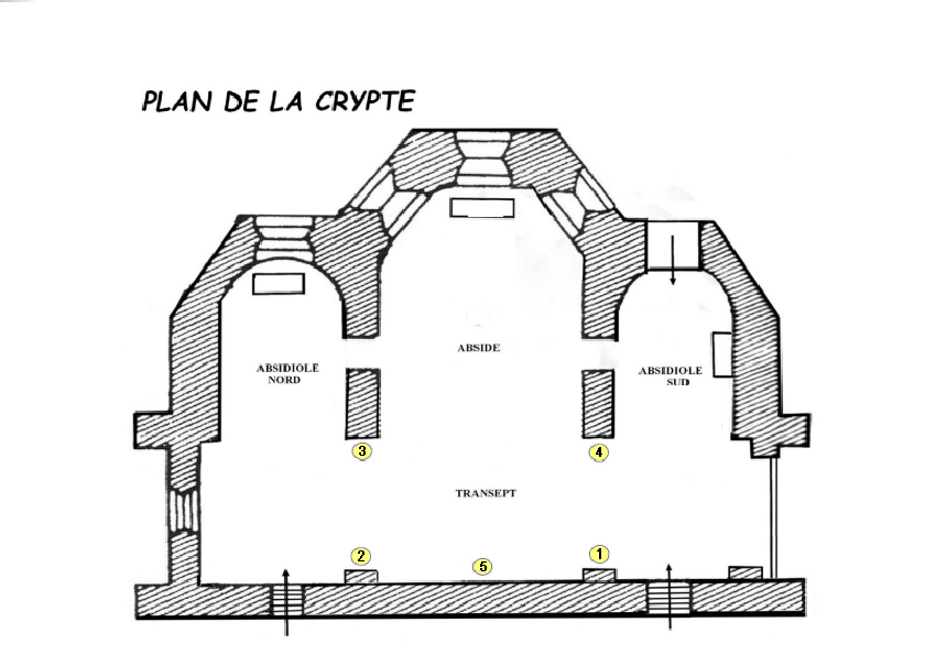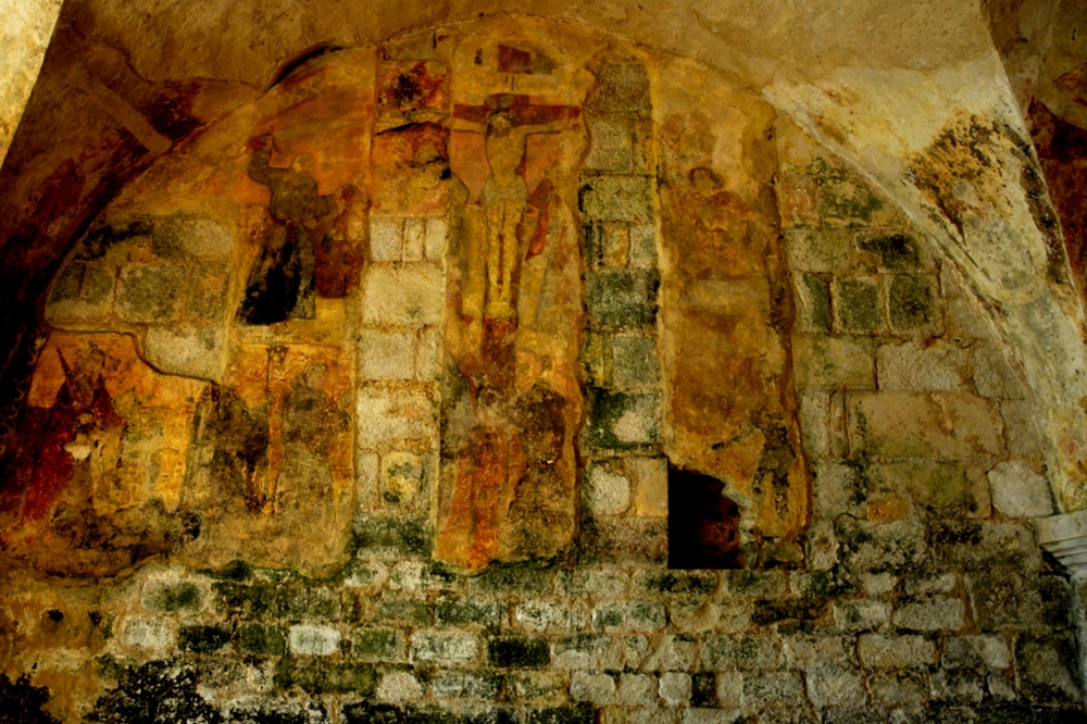 À l’origine, ce grand tableau peint sur le mur ouest du pignon de la crypte, pouvait être considéré comme la pièce maîtresse de l’ensemble iconographique du transept. Très endommagé par l’humidité, pour tenter de le sauver partiellement en laissant respirer le mur, le choix a été fait de découper et ôter de la paroi de larges bandes verticales en essayant de sauver l’essentiel.
