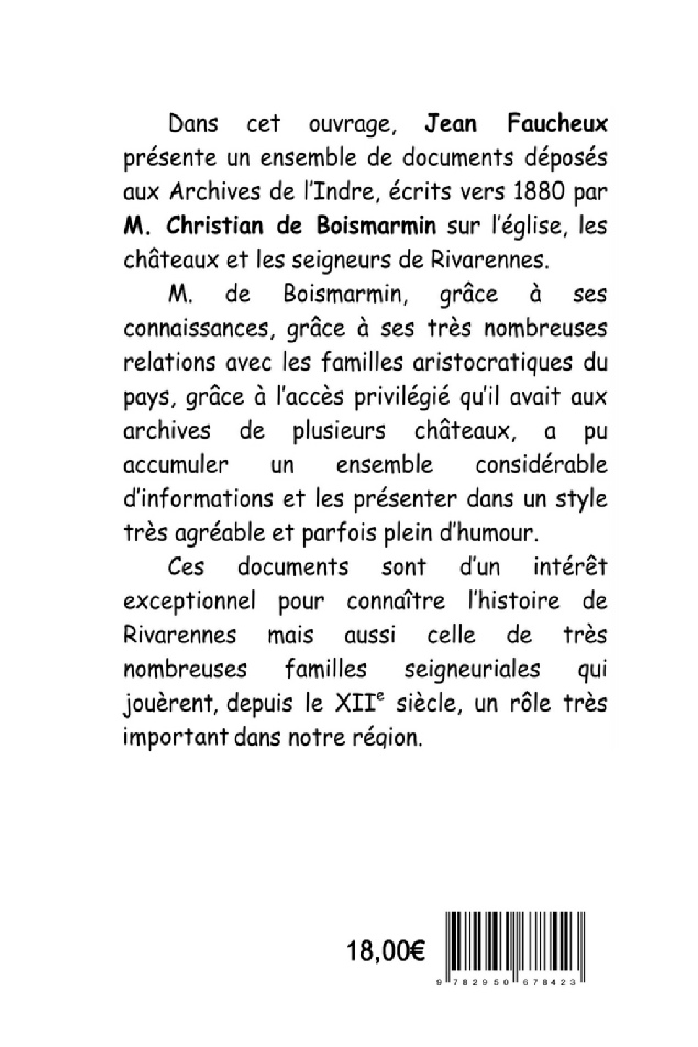 Cet ensemble de textes, d’une grande importance pour l’histoire de Rivarennes, est le fruit d’un travail de longue haleine. Il est évident que M. de Boismarmin, grâce à ses connaissances, grâce à ses relations avec les familles aristocratiques du pays, grâce à l’accès privilégié qu’il avait aux archives de plusieurs châteaux, était bien placé pour accumuler cet ensemble considérable d’informations, dates et faits concernant l’histoire de notre village et de la région depuis le XIIIe siècle jusqu’en 1883.