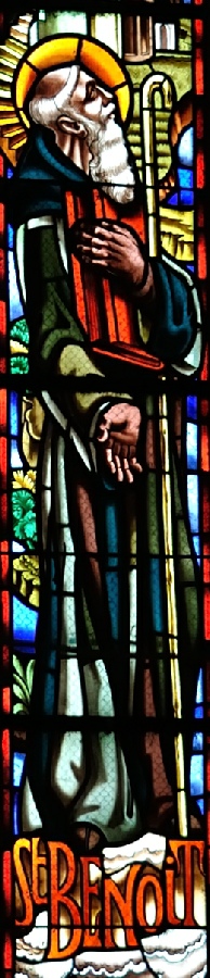 Saint Benoît, abbé. Né à Nursie en Ombrie, après des études à Rome, il commença par