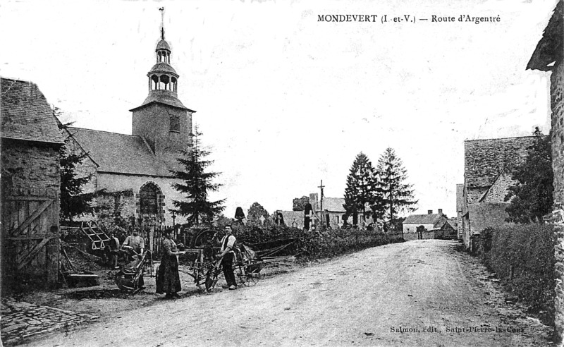 Malgré le titre de paroisse qui lui est donné dans cette pièce, Mondevert ne fut en réalité qu'une trêve[10] d'Erbrée jusqu'à la Révolution. Mais Mondevert avait son général distinct de celui d'Erbrée, et les habitants furent condamnés, en 1682, à donner à sa fabrique une gerbe de seigle par ménage chaque année, ou à son défaut la somme de 15 sols. Les trésoriers de Mondevert devaient rendre leurs comptes au recteur d'Erbrée. Pour éviter les contestations entre Erbrée et Mondevert, Mgr de Cornulier fit, le 22 mars 1639, le règlement suivant : le recteur d'Erbrée devra célébrer ou faire célébrer la grand'messe et les vêpres dans l'église de Mondevert tous les dimanches et fêtes, sauf aux fêtes de Pâques, la Pentecôte, le Sacre, Noël et la Toussaint ; ces jours-là, les gens de Mondevert assisteront à la grand'messe et aux vêpres d'Erbrée, et il n'y aura qu'une messe basse tôt le matin à Mondevert ; — il y aura à Mondevert procession, catéchisme et prône tous les dimanches et fêtes ; — on y administrera les sacrements de pénitence, d'eucharistie et de mariage, mais les baptêmes ne se feront qu'à Erbrée ; — enfin, on fera les inhumations des habitants dans le cimetière et l'église de Mondevert (Archives départementales d'Ille-et-Vilaine, 9 G, 80).