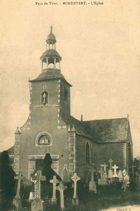 En 1790, le curé de Montdevert, M. Gallon du Tertre, déclara que les fondations acquittées par lui valaient seulement 54 livres, et que sa fabrique[11] n'avait que 30 livres de rente (Archives départementales d'Ille-et-Vilaine, 1 V, 28) ; mais ce curé devait certainement recevoir, en outre, une pension congrue[12] des décimateurs d'Erbrée. En 1803, le territoire de Mondevert fut complètement uni à celui d'Erbrée ; l'église de Mondevert, interdite même par Mgr Enoch, fut fermée en 1807 par arrêté du préfet. Mais plus tard ce sanctuaire fut ouvert de nouveau et érigé en 1832 en chapelle vicariale dépendant d'Erbrée. Enfin, le 30 janvier 1839, une ordonnance royale érigea Mondevert en paroisse, et Mgr de Lesquen en nomma premier recteur M. Chévrier le 1er février 1839 (Registre paroissial et Pouillé de Rennes).