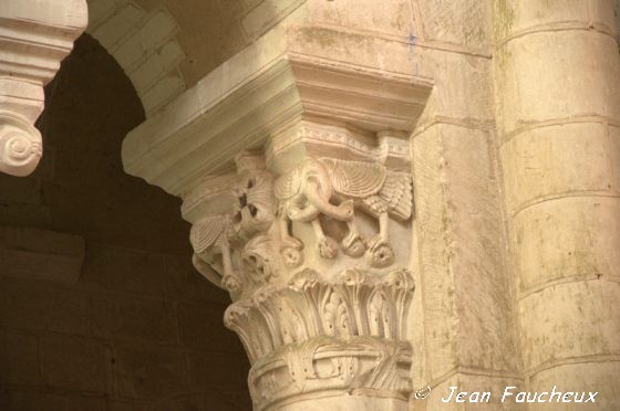 Sur ce chapiteau, le Pélican, symbole du Christ, donne son sang pour sauver ses petits ,comme le Christ, venu pour sauver le monde