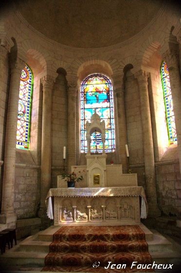 Choeur de l’abbatiale - Le bas-relief raconte la vie de saint Genou. Son tombeau est sous la table d’autel