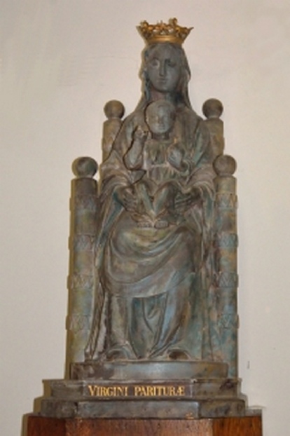 L’Enfant Jésus est représenté sous les traits d’un enfant de quatre ou cinq ans, assis dans le giron de sa mère, regardant droit devant lui, tenant la main droite levée en signe de bénédiction et portant dans sa main gauche, un globe terrestre autrefois surmonté d’une petite croix dorée. L’ensemble de la statue est de couleur sombre, parsemée de reflets bleus et violets et sur le piédestal, en lettres dorées, est écrite la fameuse inscription : VIRGINI PARITURAE. Cette statue, de belle facture, semble dégager calme et sérénité.