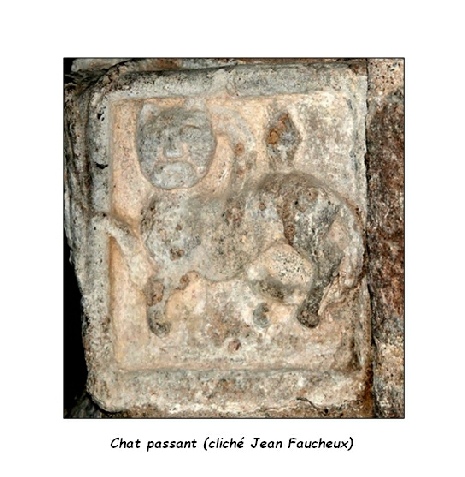 Sur la face de droite de ce second bloc, un chat passant est représenté la tête tournée, nous regardant fixement comme sur les figures héraldiques, alors qu’il lève la patte avant droit. Sa longue queue, passe entre ses pattes et se relève jusqu’à sa tête. En haut, au-dessus de sa croupe, une sorte de flèche qui rappelle la tête d’un serpent. Remarquons que le chat à une tête de grosseur disproportionnée par rapport au reste du corps.