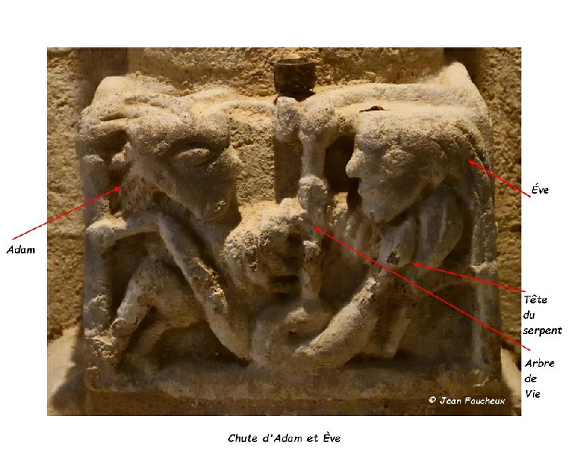 Dans cette scène que le sculpteur a magistralement réalisée, Adam, à gauche, est représenté en beau jeune homme, le visage calme et serein : il semble écouter attentivement. En face, Ève, jeune femme aux cheveux longs, tient de sa main droite le tronc de l’arbre de la connaissance. Sa main gauche devait tenir la pomme. Au-dessous d’Adam et Ève, le serpent, le tentateur, semble se hisser jusqu’à l’oreille d’Ève pour lui susurrer qu’au contraire, ils peuvent manger du fruit défendu et qu’ainsi ils auront la vie éternelle 7.