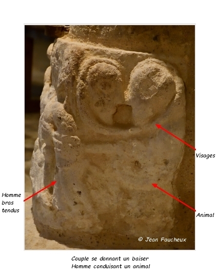 Tout en haut du bloc, nous distinguons nettement deux têtes sculptées de profil, un homme et une femme. Ils se font face en se touchant par le bout du nez. La scène est sculptée dans une sorte d’ellipse. Les visages des deux personnages sont très simplifiés, presque naïfs, ce qui est caractéristique de l'art roman (XIe - XIIe siècle).