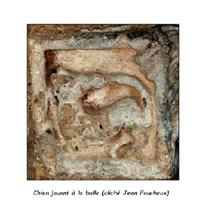 Au Moyen Âge, le chien était un animal très connu, fidèle compagnon du foyer mais aussi du chasseur. On le citait en exemple pour sa fidélité. D’après M. Gérard Guillaume, cette sculpture pourrait être rapprochée de la sculpture d’un chien qui se mord la queue, sculptée sur un chapiteau de la rotonde de Neuvy-Saint-Sépulchre et une sculpture au tympan du narthex de Vézelay où le chien est associé à une sirène et à un acrobate. Ce thème illustrerait, d’après le frère Hugues Delautre, franciscain, les qualificatifs du temps au Moyen Âge : le temps est séducteur comme une sirène, trompeur comme un acrobate et insensé comme un chien qui se mord la queue.