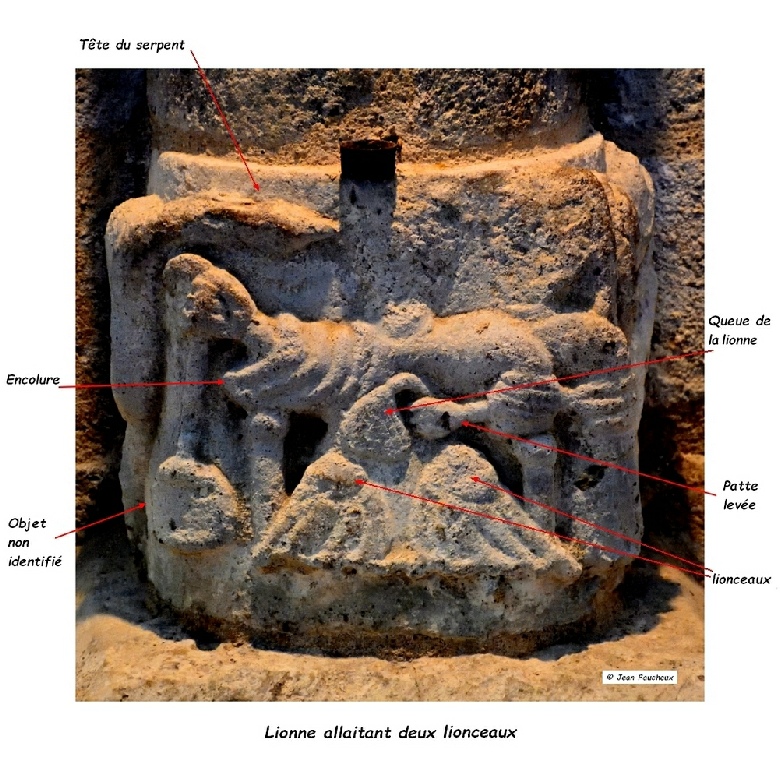 Lors de la découverte de ses blocs historiés en octobre 2020, nous avions pensé y voir une louve allaitant ses petits, à la manière de la louve romaine 3. En approfondissant nos recherches, nous sommes persuadé aujourd’hui qu’il ne s’agit pas d’une louve mais d’une lionne allaitant ses petits.